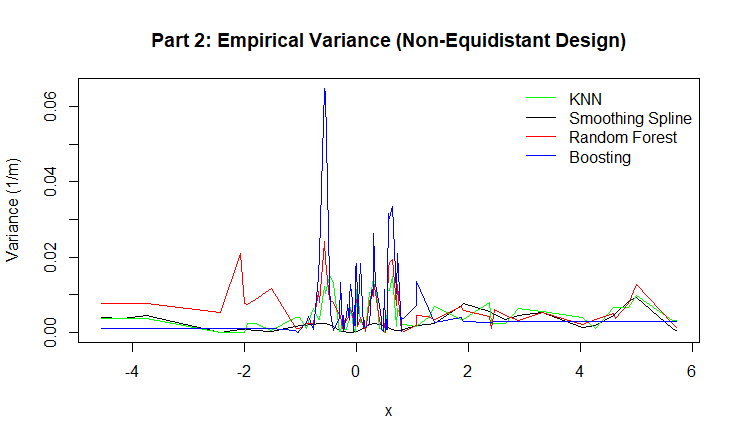Figure 8: Empirical Variance for for KNN, Smoothing Spline, Random Forest, and Boosting.