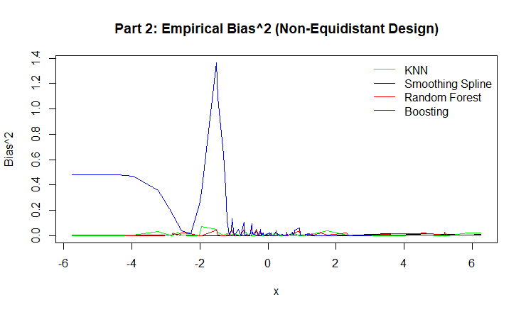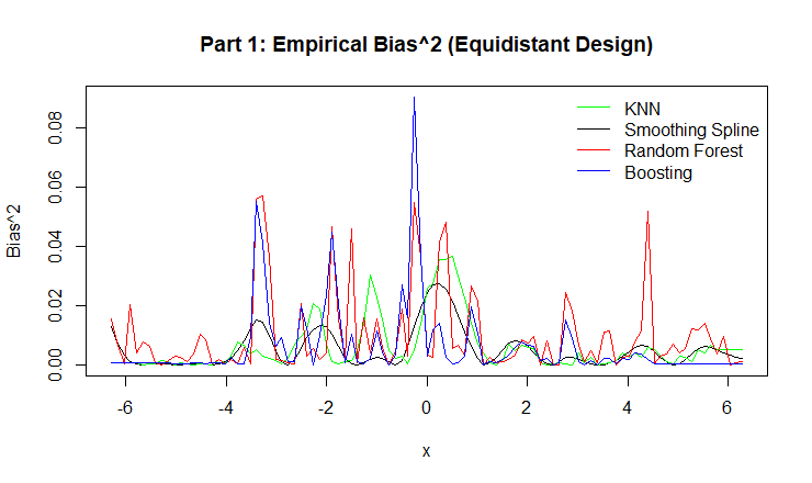 Figure 7: Empirical Bias for KNN, Smoothing Spline, Random Forest, and Boosting.