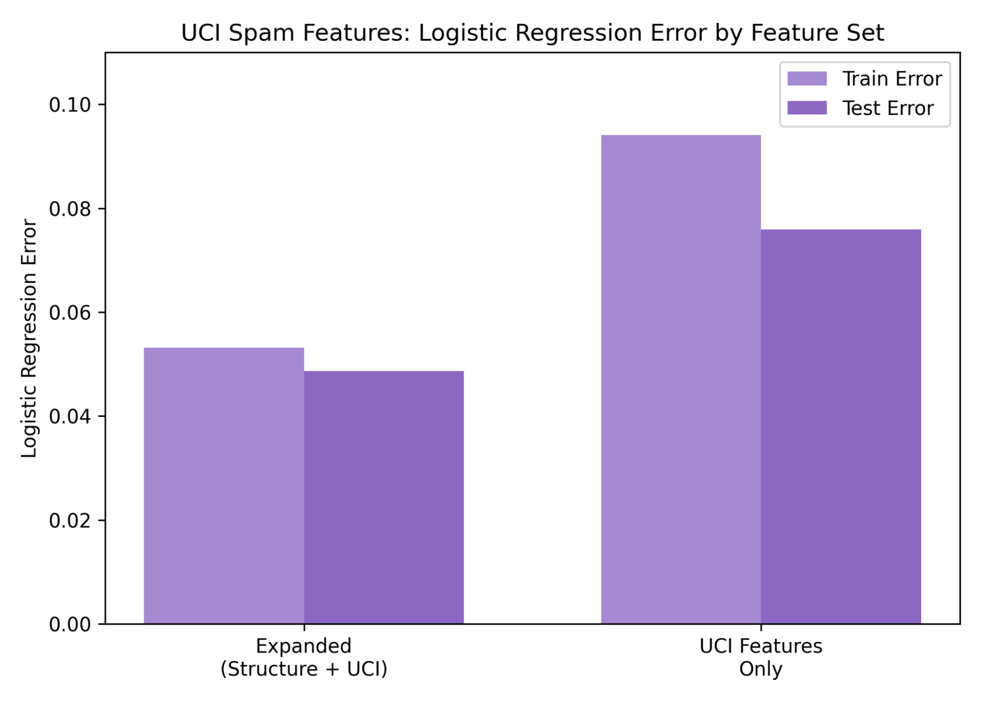 Figure 8—Logistic Regression prediction errors for UCI and UCI/Structural features. The expanded feature set slightly outperforms the UCI features on the UCI SMS dataset by .0409