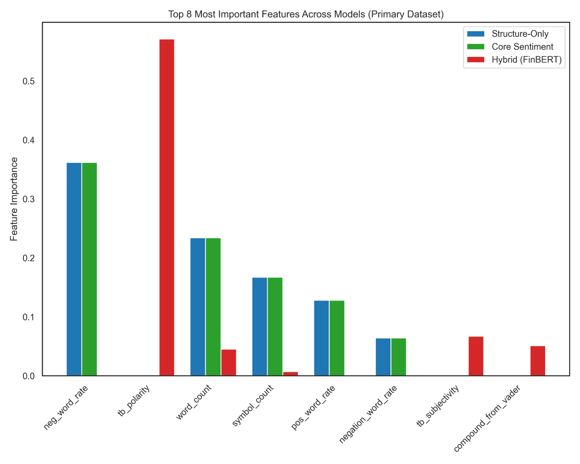 Hybrid Features — A mix of all structural features, all core lexicon features, and NLP Finbert extractions of [Negative probability, Positive probability, Neutral Probability, Compound Probability based on explicit crisis or growth terms] (see appendix).