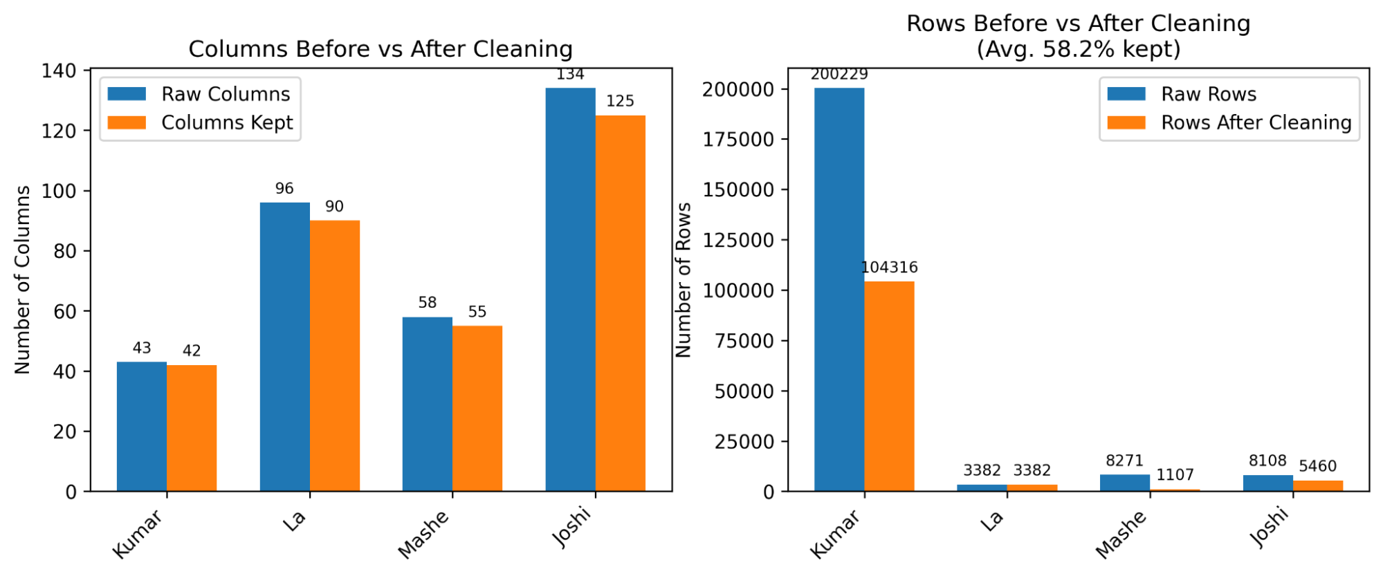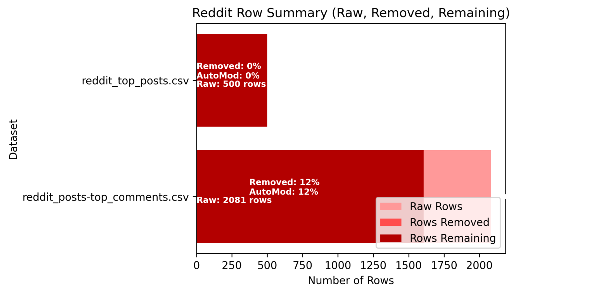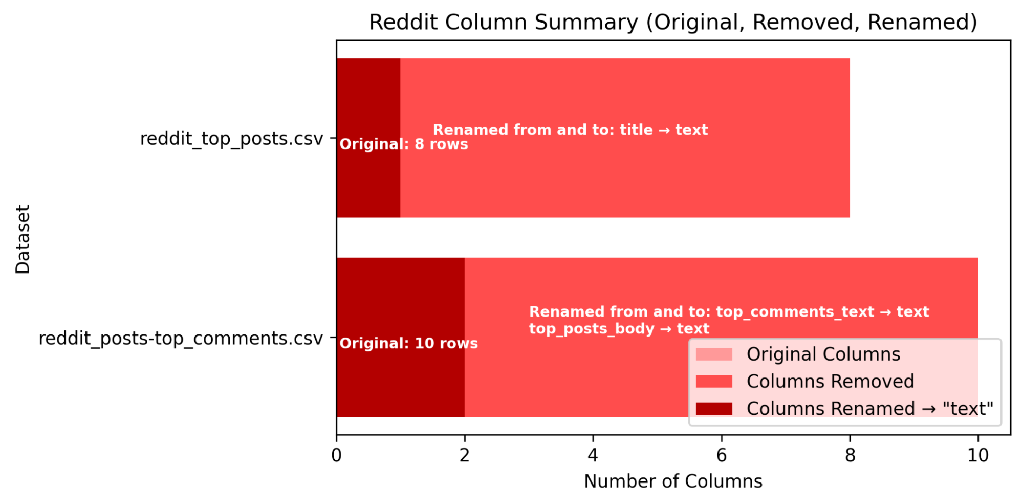 Figure 6— Columns and rows of Reddit datasets before and after cleaning.