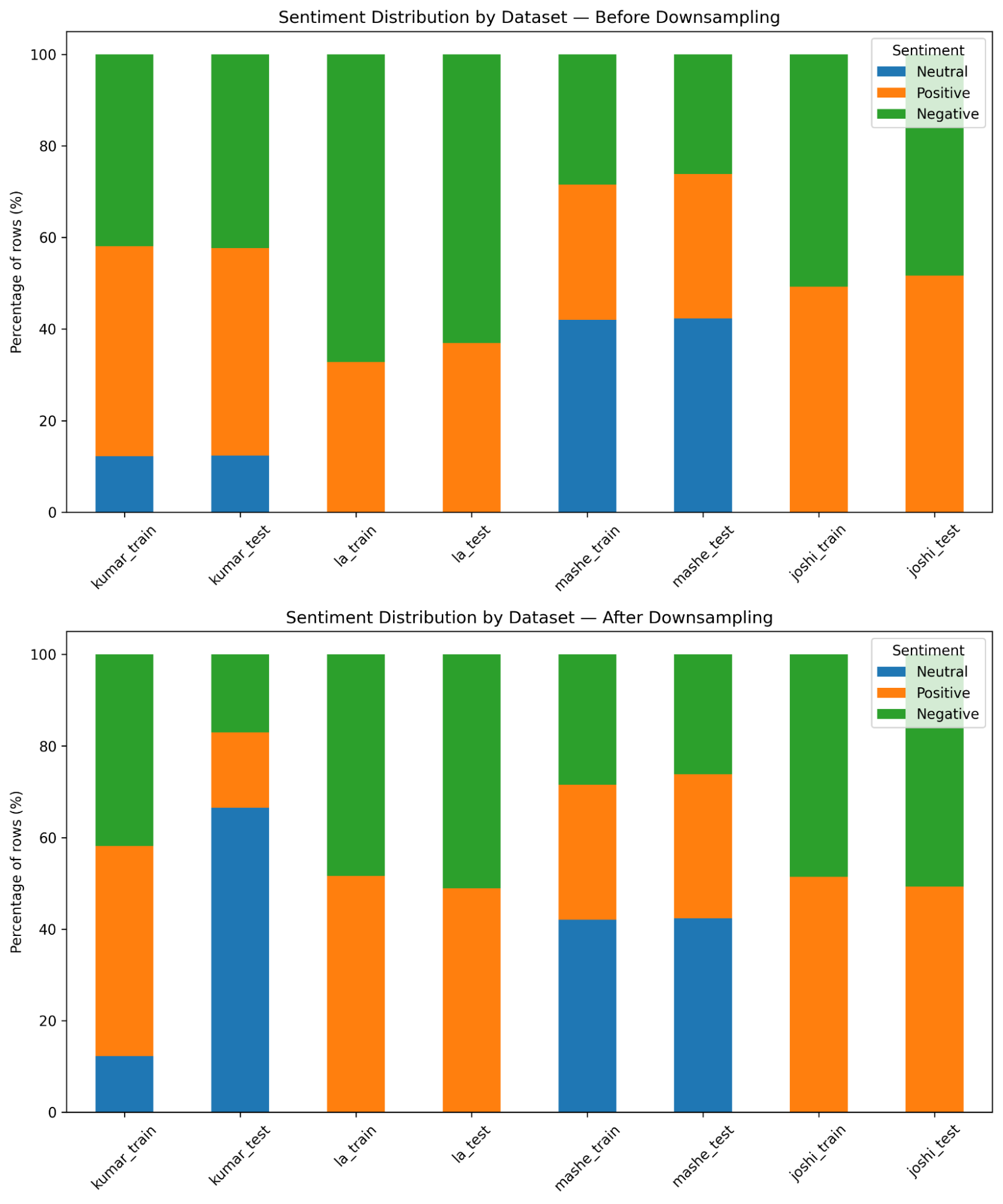 As for class imbalances with sentiment labeling, the datasets were downsampled in two ways: