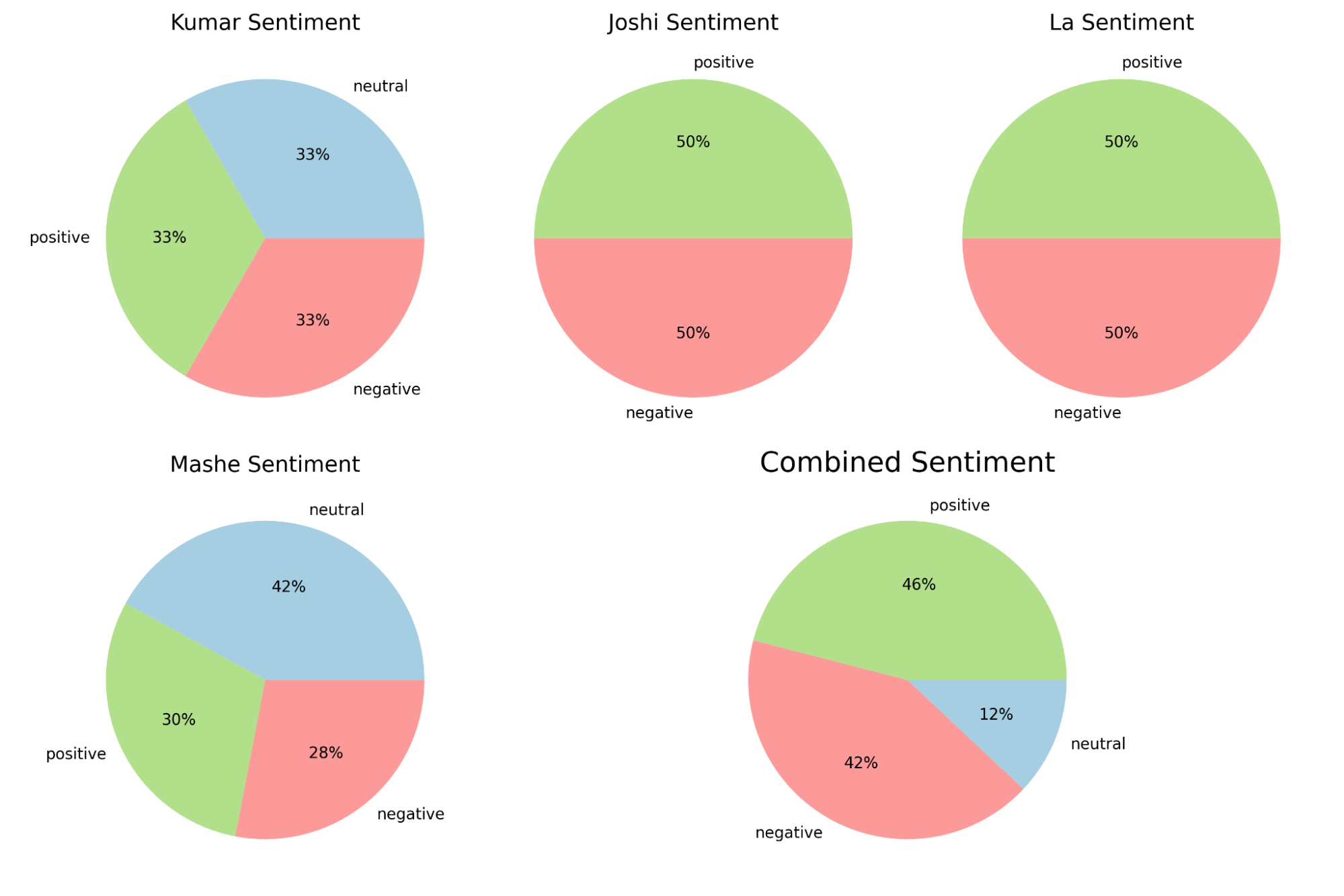 Figure 3—Train and test compositions of the combined dataset, and sentiment class balance for each dataset: Kumar, Joshi, La, Mashe. Joshi and La did not have neutral sentiments, reflected in the balance of Combined Sentiment .