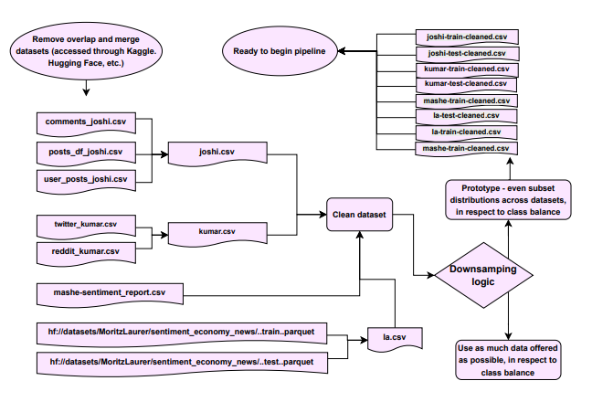 The iterative process between cleaning, extracting, and running models through different features is inherently not a linear process. To ensure rapid experimentation and completing the sentiment analysis with a variety of different datasets, features, and proper usage of models, a sample of four different datasets were finalized. The sample datasets and pipeline can be considered as an early prototype demonstrating the evolution of the modeling process. Differentiating sentiment from different cultures of social media platforms, topics of conversation, and emotions like sarcasm or humor are challenges that long-standing research communities continue to address, each with its own specialized goals. Creating a sentiment pipeline specifically for platforms like Reddit, and classifying conversations relating to economic realities, is the heart of this project.