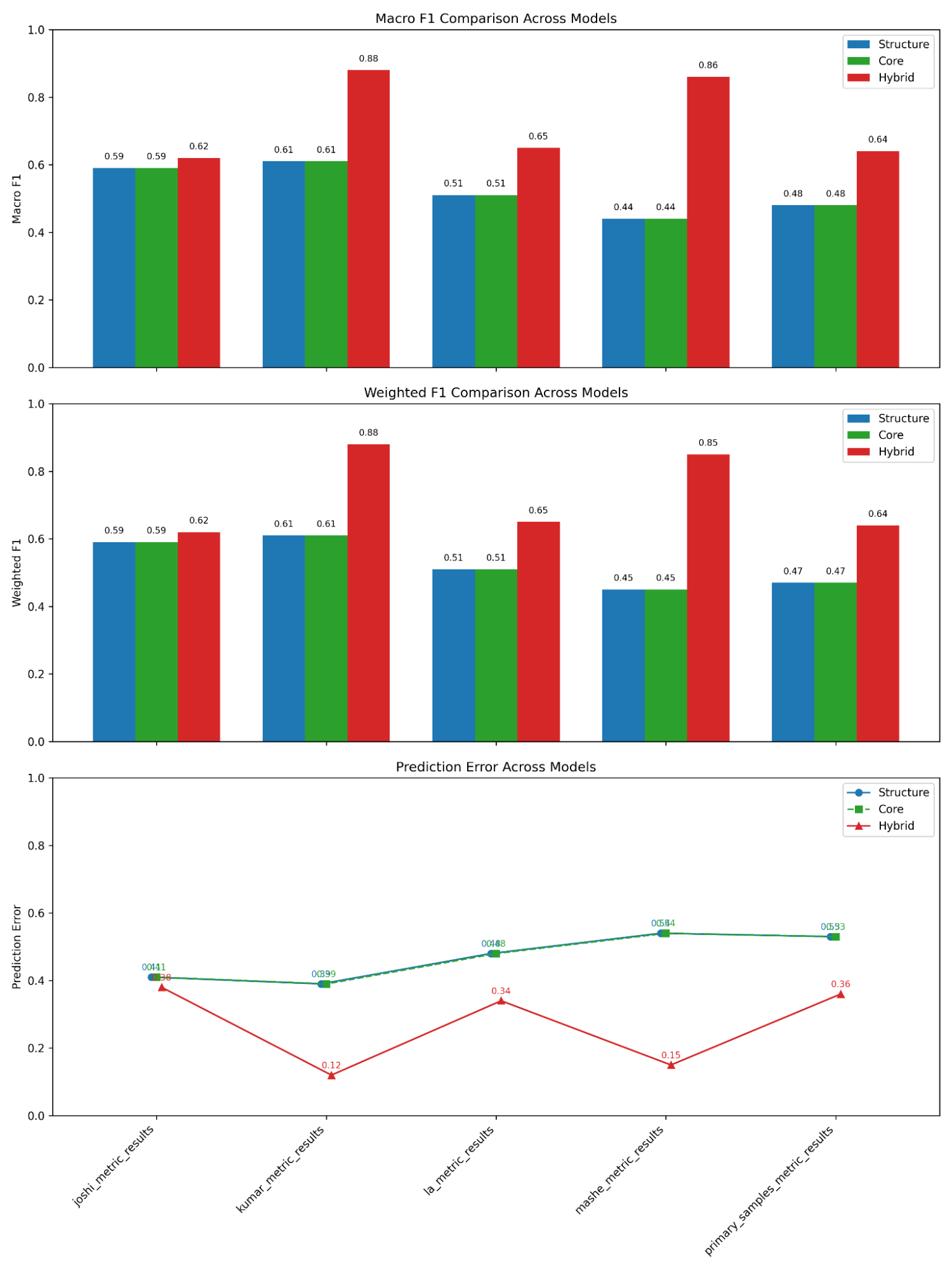 Figure 11—Random Forest Tree results in Macro F1, Weighted F1, and Prediction Error for Structure, Core, and Hybrid feature sets across all sample datasets. Performance levels vary across datasets due to differences in writing style and platform conventions, but Hybrid Features consistently achieve the highest scores. The figure highlights how linguistic variability affects overall difficulty while preserving the same feature-set ranking.
