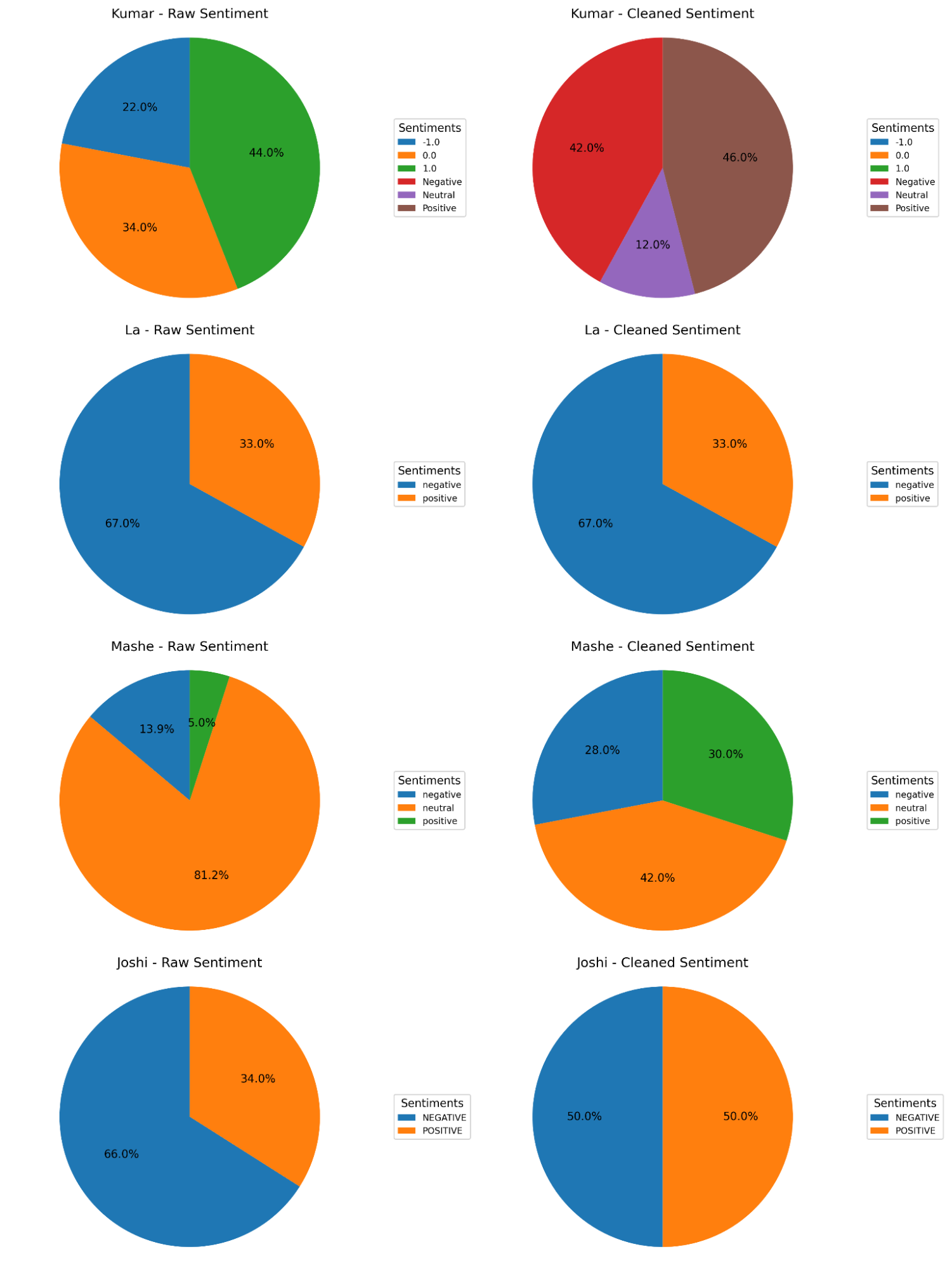 Figure 2— Columns and rows of original datasets before and after cleaning (no downsampling), and Sentiment distribution of original datasets before and after cleaning. Kumar’s sentiment values are renamed from [1.0, 0, -1.0] to [‘Positve’, ‘Neutral’, ‘Negative’]. Kumar has the largest number of rows and La has the least number of rows.
