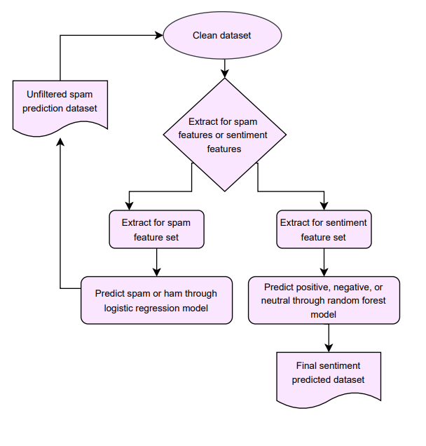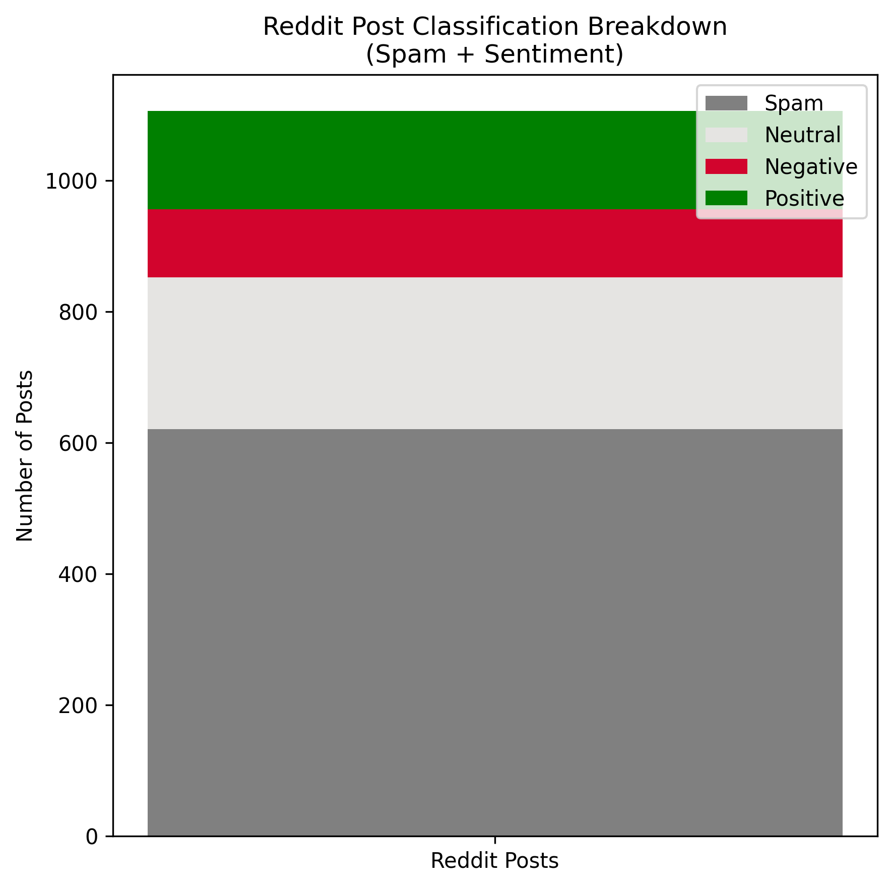 The finalized pipeline—consisting of Logistic Regression for spam filtering and a Random Forest classifier applied to the Hybrid Feature set for multi-class sentiment prediction—successfully generated sentiment estimates for Reddit posts despite the constraints of limited and temporally clustered data.