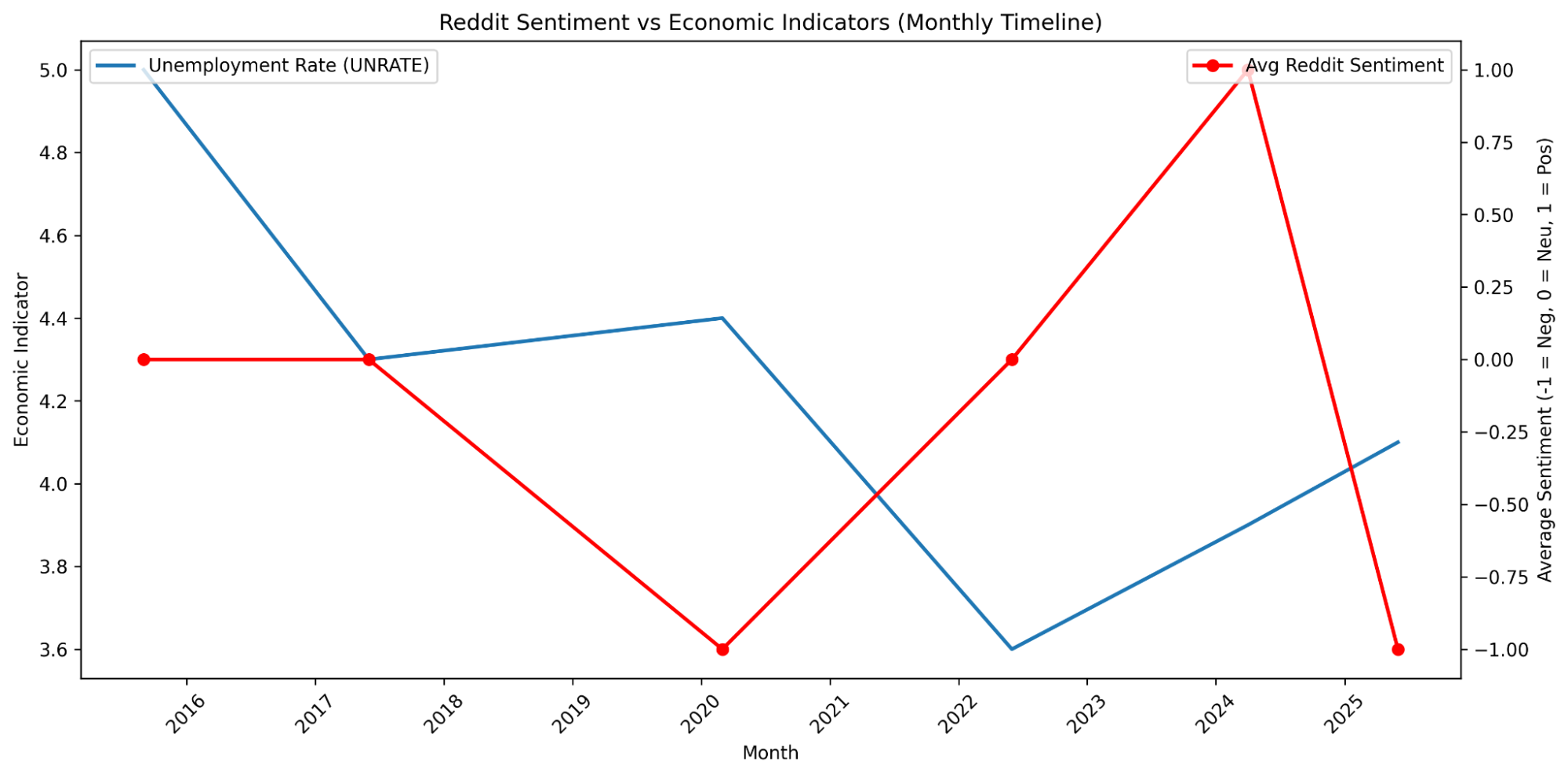 Although an inverse pattern appears—sentiment increasing as unemployment declines and dropping sharply at the end—these fluctuations likely reflect data sparsity and extraction limitations rather than meaningful economic signals. The PRAW API doesn’t permit retrieval of posts by timestamp, which led to heavily clustered within recent months, resulting in a restricted, uneven, and relatively small sample. This constraint, combined with class imbalance within the sentiment labels, results in a noisy sentiment trend that cannot accurately describe economic patterns.