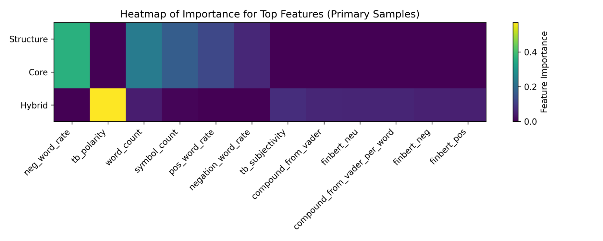 Figure 9—Heatmap and Chart illustrating the most influential features within each feature group—Structural, Core Lexicon, and Hybrid—under a shared Random Forest model. Identifying which features carry the greatest weight within their respective groups provides insight into the linguistic signals emphasized by each feature set. This type of analysis supports the broader iterative feature-engineering process used throughout the project, informing decisions about which features or feature groups are most promising before evaluating their performance across diverse datasets.