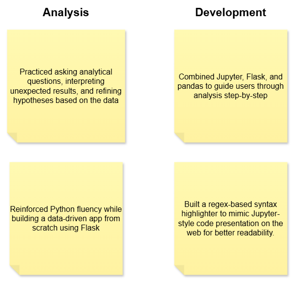 From a technical perspective, the project reinforced Python fluency while expanding my development skill set. I integrated Jupyter, Flask, and pandas into a unified workflow, built reusable functions for data handling, and designed presentation logic that prioritizes clarity and user comprehension. Throughout the project, I maintained a product-thinking mindset—focusing on how users experience the analytical journey, not just the final outputs. I’m excited to continue developing these skills as I begin my Master’s in Analytics and pursue data-focused internships.